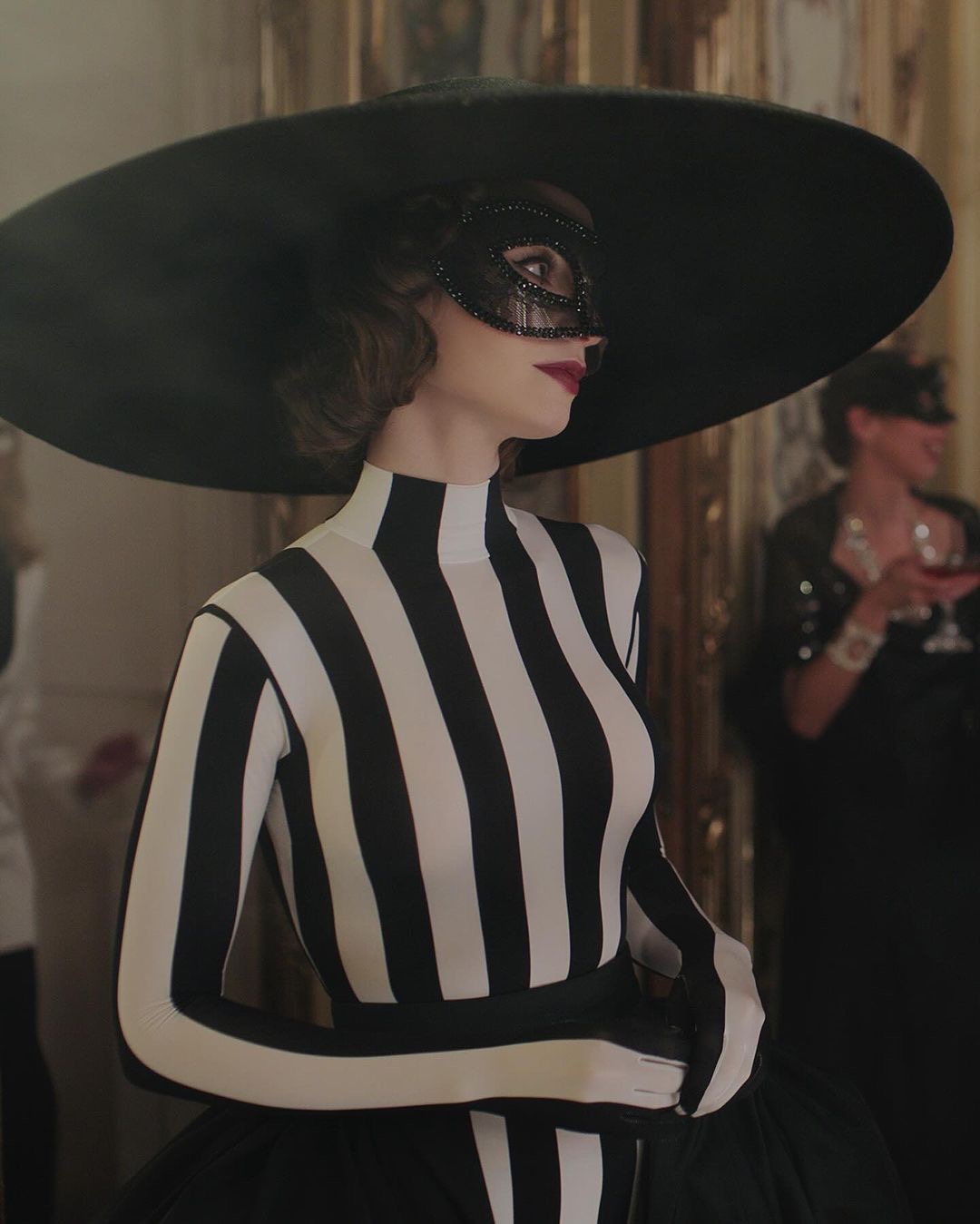 Emily Cooper, interpretada por Lily Collins, sigue siendo el centro de atención con su estilo audaz, que algunos aman y otros odian. En esta temporada, su look refleja una evolución en su confianza y adaptación a la vida parisina. El “french girl style” es la clave que buscó Marylin Fitoussi, la diseñadora de vestuario. Ahora vemos una Emily más madura, pero que sigue fiel a su estilo. Los conjuntos incluyen desde piezas de alta costura hasta prendas vintage, con un uso destacado de estampados atrevidos y combinaciones de colores llamativos. Uno de los looks que se robó la atención fue el catsuit a rayas blancas y negras que usó para el baile de máscaras en el tercer episodio.