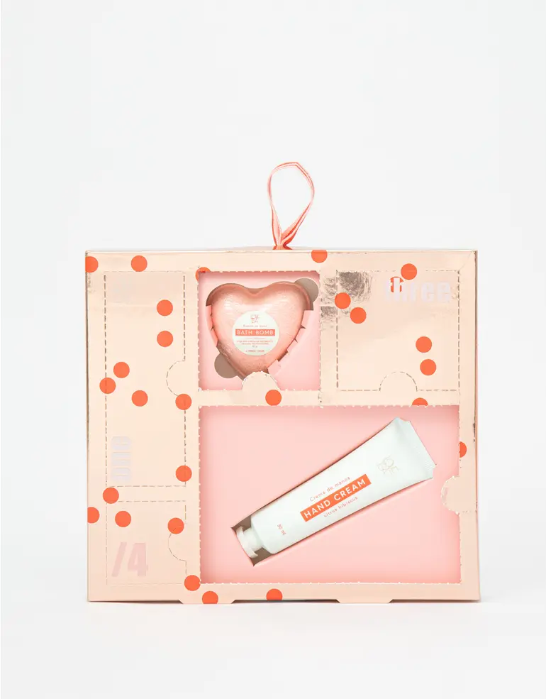 - Incluye: bálsamo labial, exfoliante de labios, crema de manos, bomba de baño, jabón.